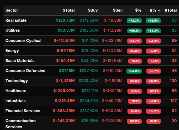 Notably, Utilities and Real Estate stood out on the buy side. Real Estate posted a +78% lean and Utilities nearly +60%, both comfortably above the +66% threshold that signals more directional buying rather than simple sector rotation. Consumer Defensive also showed positive dollar flow, but with mixed participation, suggesting selective buying rather than aggressive accumulation.