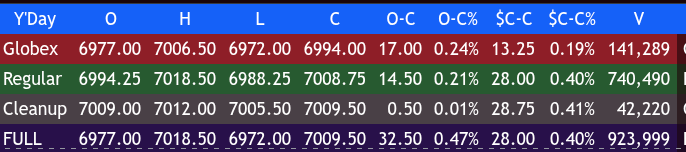 The ES traded up to 7006.50 on Globex with a total of 140k contracts traded and opened Monday’s regular session at 6994.25, up 13.5 points or +0.19%.