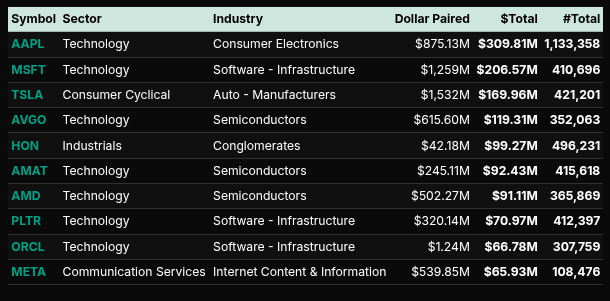 Sector behavior validated the rotation underneath: tech remained the dominant recipient of buy flow, while semiconductors were unusually split—large-cap names like NVDA, QCOM, and KLAC printed heavy sell leans even as AMD, AVGO, and AMAT were bid. Defensive sectors (Utilities, Basic Materials, Consumer Defensive) printed wholesale selling with leans below –50%.
