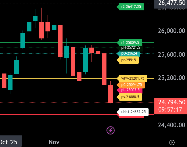 Overall, sentiment remains bearish beneath 25,201.75, and further downside exploration toward 24,632.25 and 24593.75 is possible unless NQ can reclaim the bull/bear line during RTH.
