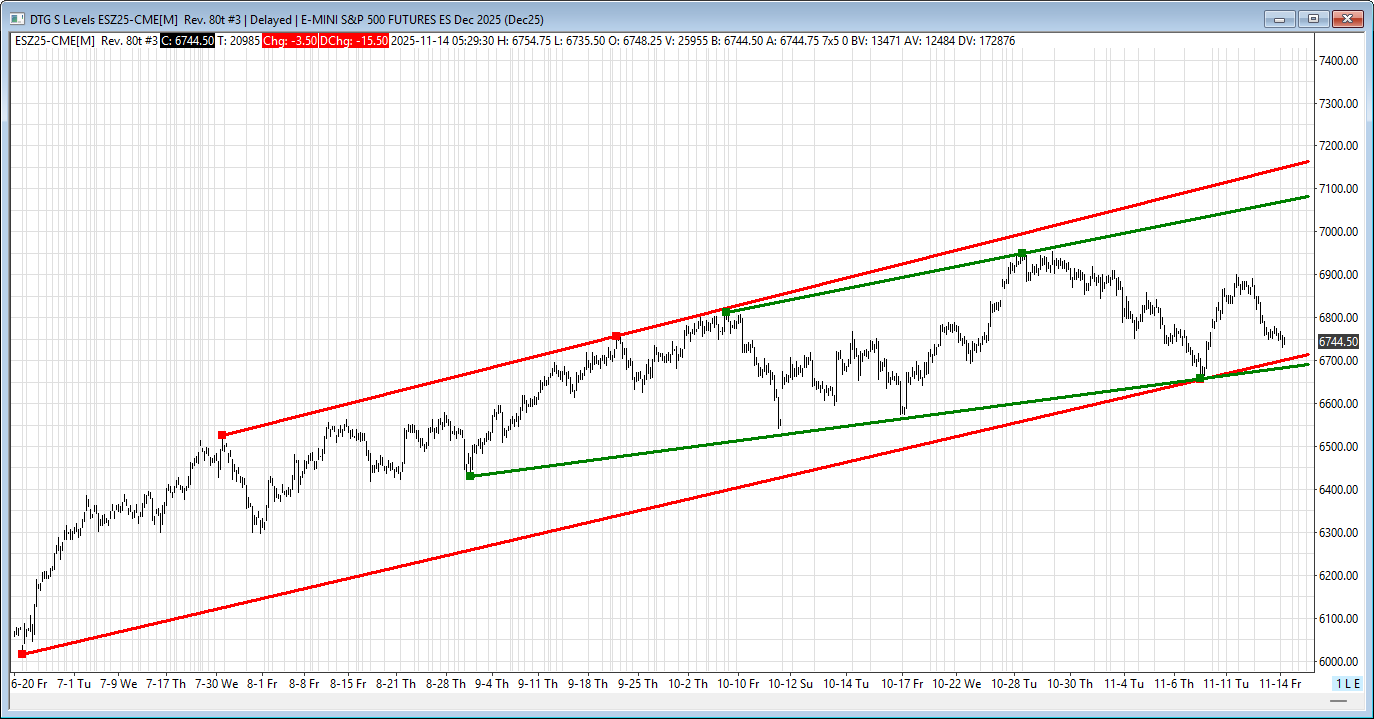 It’s unlikely the tech/AI selling is over, but let’s not forget what happened late last Friday when the ES put in a 6655.50 low and then rallied 245 points over the next 2.5 days. If the ES gaps lower, it could bounce—but recently, those bounces have failed.