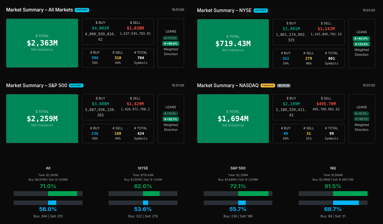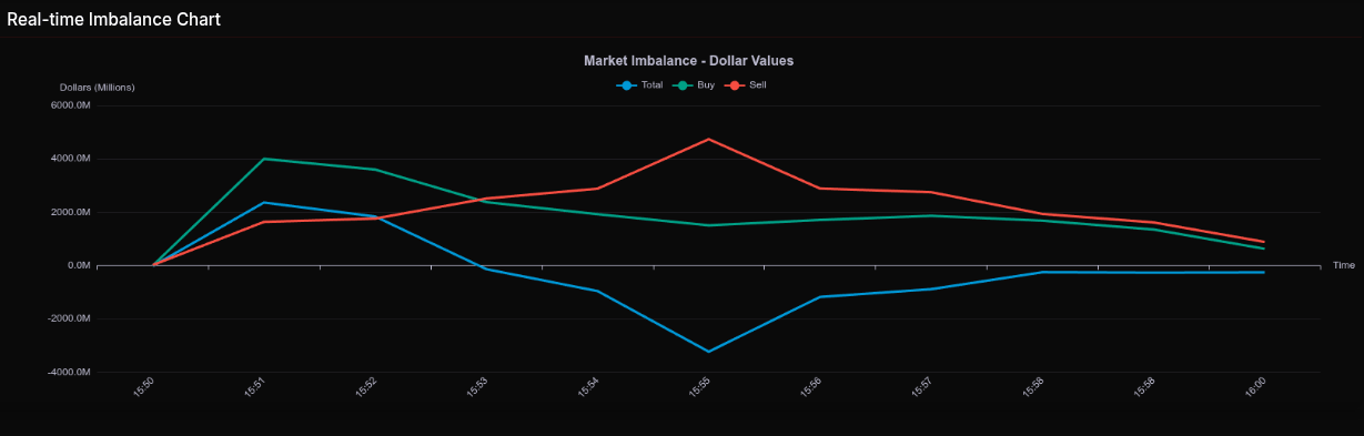 Brief MOC buy imbalance ($2.1B) flipped aggressively to a sell imbalance ($3B), accelerating the late-day selloff into the close.