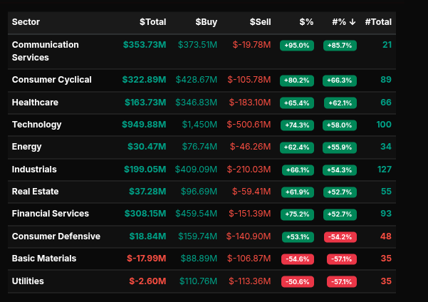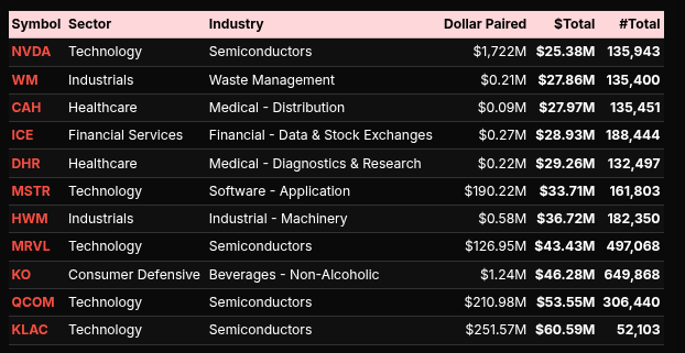 Sector behavior validated the rotation underneath: tech remained the dominant recipient of buy flow, while semiconductors were unusually split—large-cap names like NVDA, QCOM, and KLAC printed heavy sell leans even as AMD, AVGO, and AMAT were bid. Defensive sectors (Utilities, Basic Materials, Consumer Defensive) printed wholesale selling with leans below –50%.