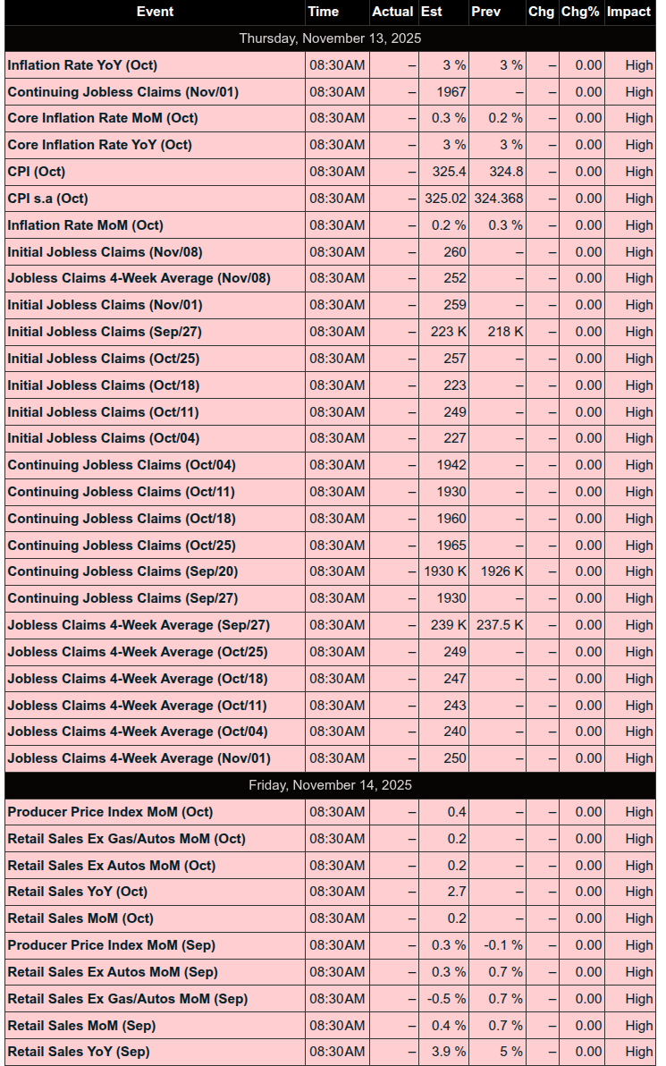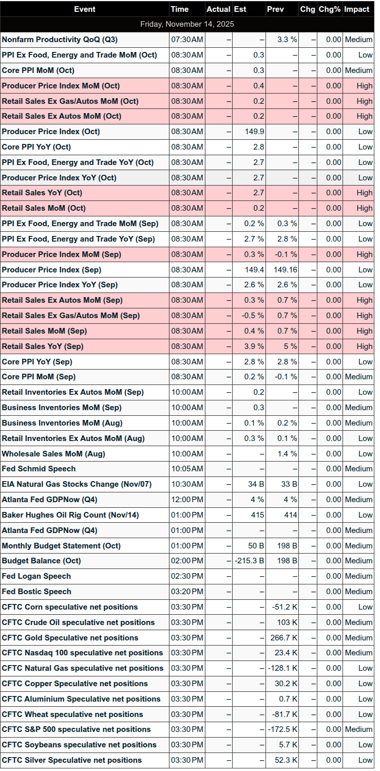 Macro & Rates: Thursday’s sharp selloff driven by rising belief the Fed won’t cut rates again this year. Fed speakers are pushing a wait-and-see approach. Delayed economic data releases post-shutdown could spark further volatility. Gold is having its best week in over a month on uncertainty.