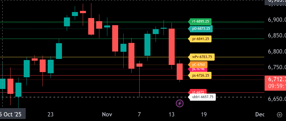 Overall, the market remains defensive while holding under 6783.75, and buyers would need a reclaim of that level to regain short‑term control.