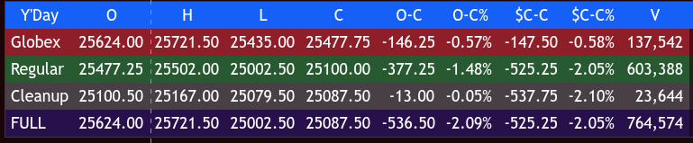 After 4:00, the ES rallied to 6778.00 at 4:15, sold off, and settled at 6752.50, down 104.50 points or -1.42%. The NQ settled at 25,087.50, down 390.25 points or -1.53%—its largest decline (along with the ES and YM) since October 10.