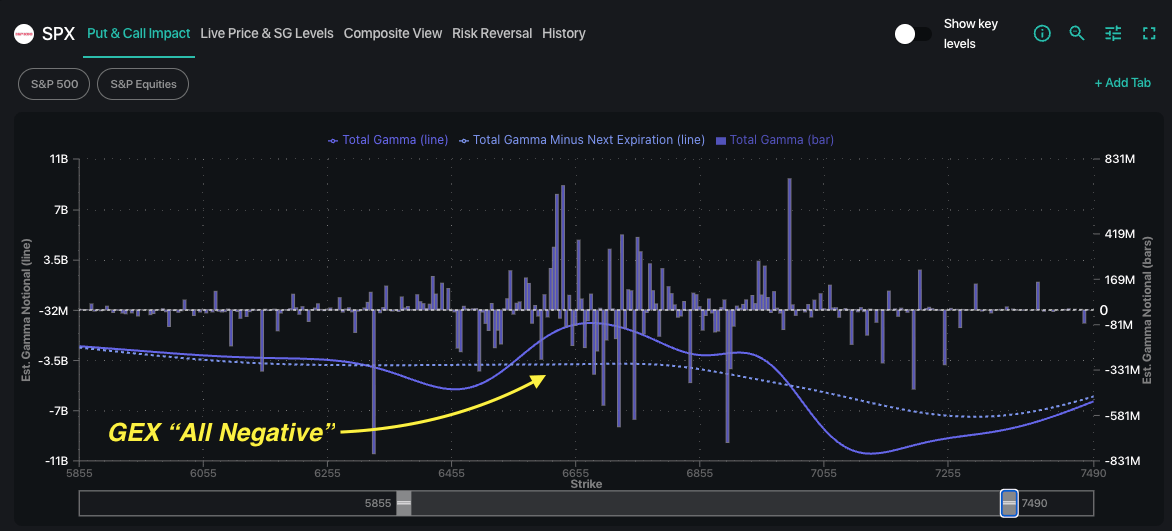 TLDR: While we were admittedly leaning long while SPX was above the 6,800 Risk Pivot, we are now all bearing witness to the “elevator down” dynamics present when flows shift from supportive to destructive. On this topic we have no clear risk-on level at the moment, as gamma is negative across the board and there is no clear sentiment/position clearing until Wed.