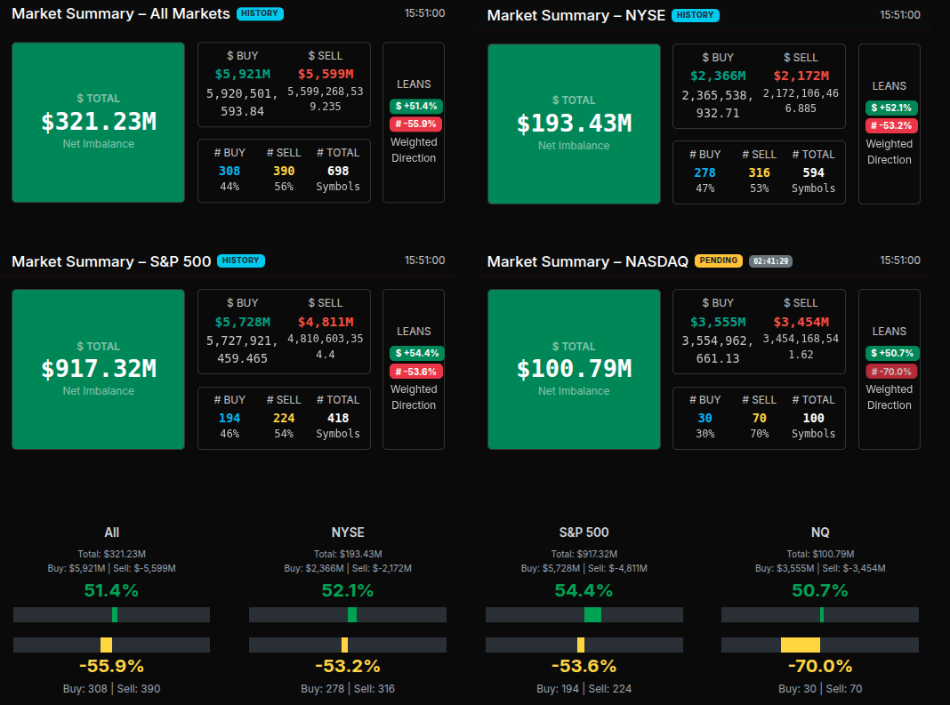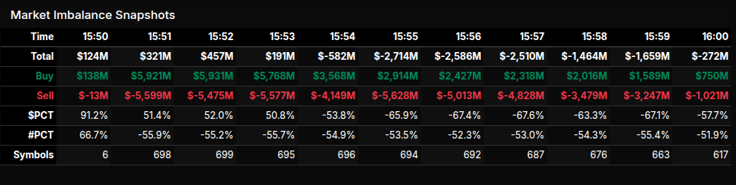 The Market-on-Close auction opened with a modest net buy imbalance and quickly morphed into a highly rotational tape before resolving into broad-based selling pressure. At 15:51, the total imbalance registered +$321M, masking a tug-of-war under the surface: buy dollars were heavy, but sell-side symbol counts already outnumbered buys, a theme that persisted through the remainder of the session.
