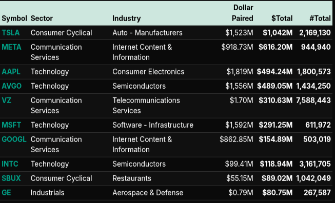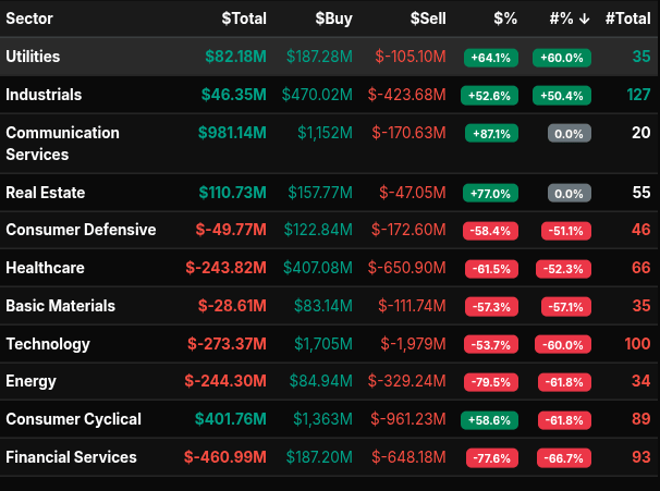 On the buy side, Utilities, Industrials, Communication Services, Real Estate, and Consumer Cyclical absorbed capital, but most of these leaned closer to the +50% range — rotational, not outright accumulation. Communication Services stood out with a strong dollar total, supported by META, GOOGL, and VZ activity, though symbol counts remained thin.