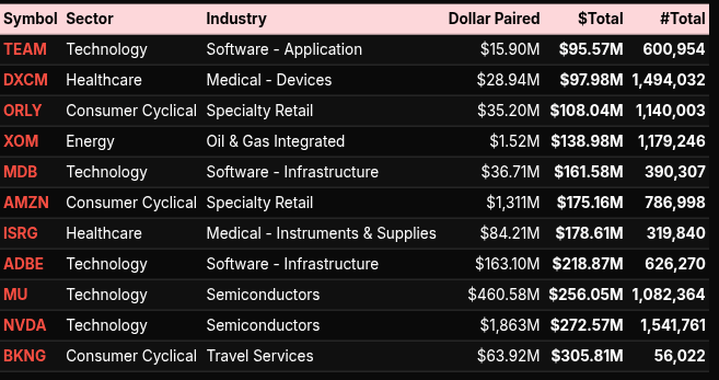 Single-stock flow underscored the bifurcation. NVDA, MU, AVGO, MSFT, and AAPL all traded massive paired dollars, yet the aggregate technology sector still closed net negative — a sign that strength was used to sell into. TSLA and META attracted sizable demand, while energy pressure was concentrated in XOM.