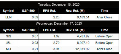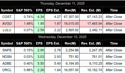 Markets await the delayed November Jobs Report (8:30am ET), expected to show a modest 50K job gain and a rise in unemployment to 4.5%. This data, along with delayed retail sales and business inventories, will shape Fed expectations heading into early 2026. FedWatch currently reflects expectations for two rate cuts next year.