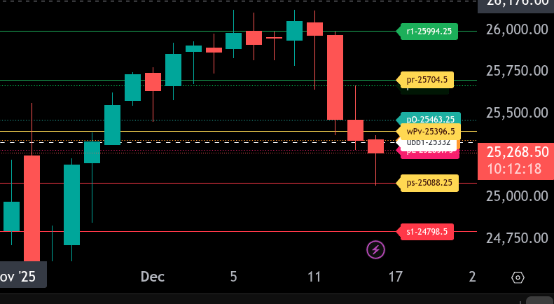Immediate resistance levels are 25,332.00, 25,342.75, and 25,396.50. Sellers are likely to defend these areas on any bounce.