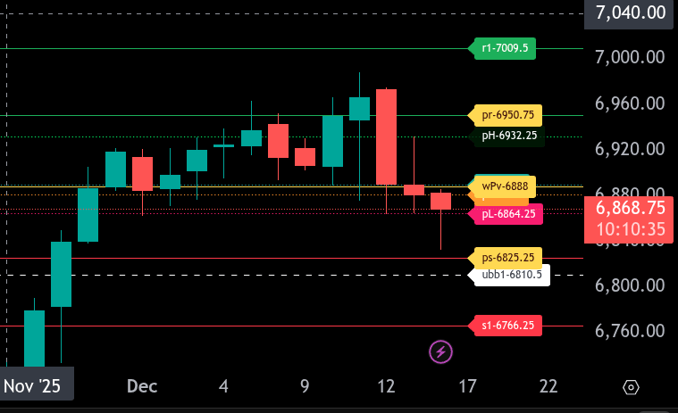 The lower range target is 6825.25. Immediate support sits at 6864.25, then 6825.25. A sustained break below 6825.25 opens the door toward deeper downside at 6810.50 and potentially 6766.25.