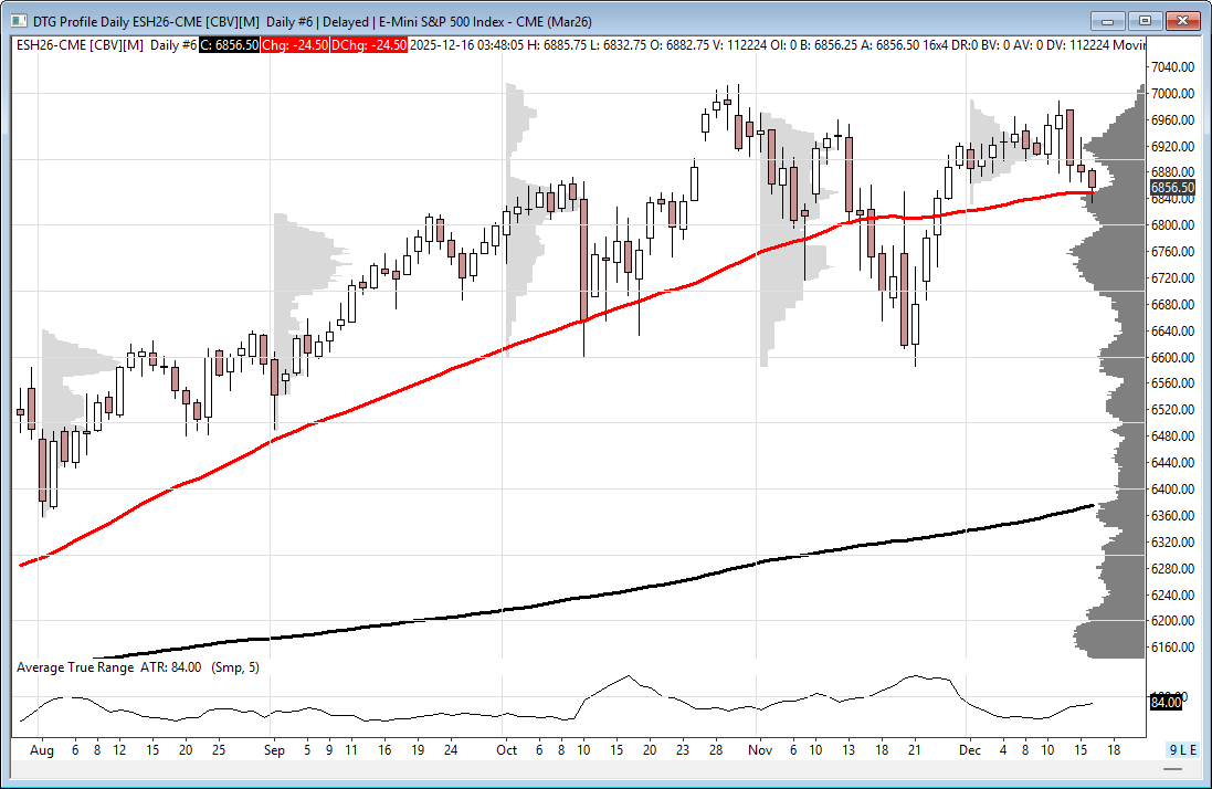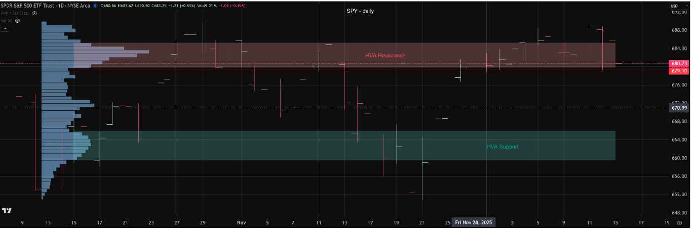 The SPY chart indicates that price action has remained in a balanced, sideways trading regime since October 13. In market profile and auction theory terms, balance reflects a state of uncertainty, where neither buyers nor sellers possess a sustained advantage. Absent a meaningful change in market conditions, this environment suggests the potential for continued range-bound trade.
