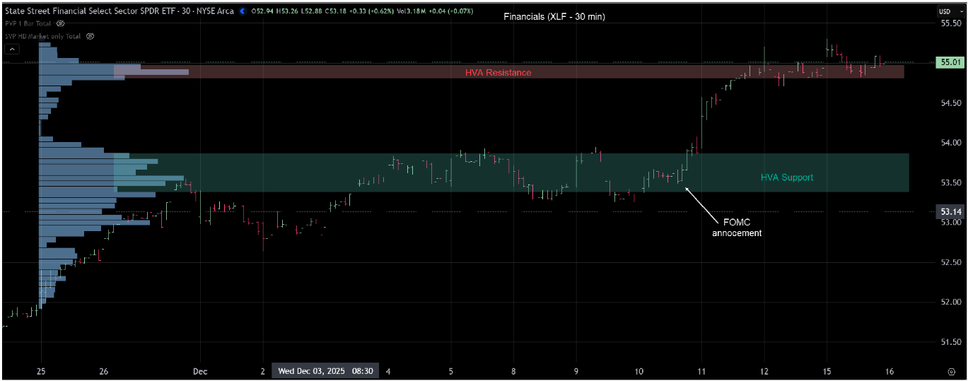 While the broader equity indices remain largely range-bound, sector-level opportunities continue to emerge beneath the surface. Financials, as represented by XLF, recently broke out of a prior balance area, reaching new highs following last Wednesday’s FOMC announcement.