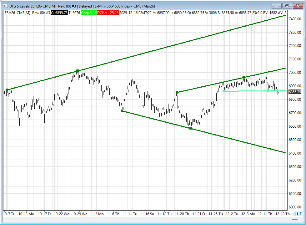 In the end, I’m not quite sure why things slowed so much, but most of the ES’s trading range was between 10 to 15 points. In terms of the ES’s overall tone, the NQ weakness continues to dominate the tape. Dec contracts had just 590K traded and the new April 2026 contracts took volume lead trading 975K.