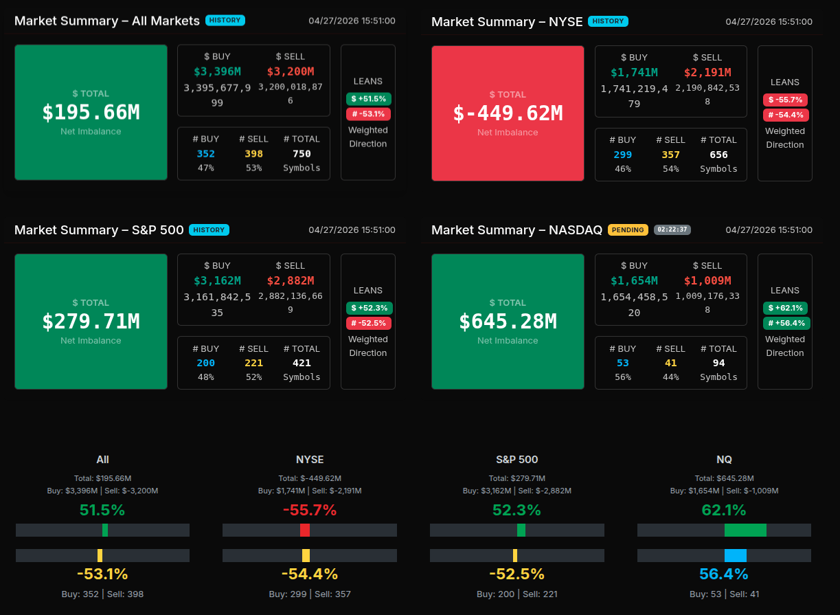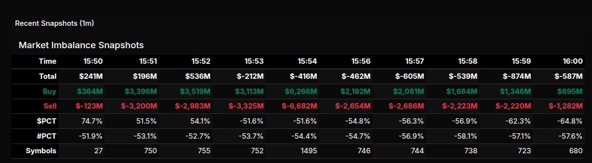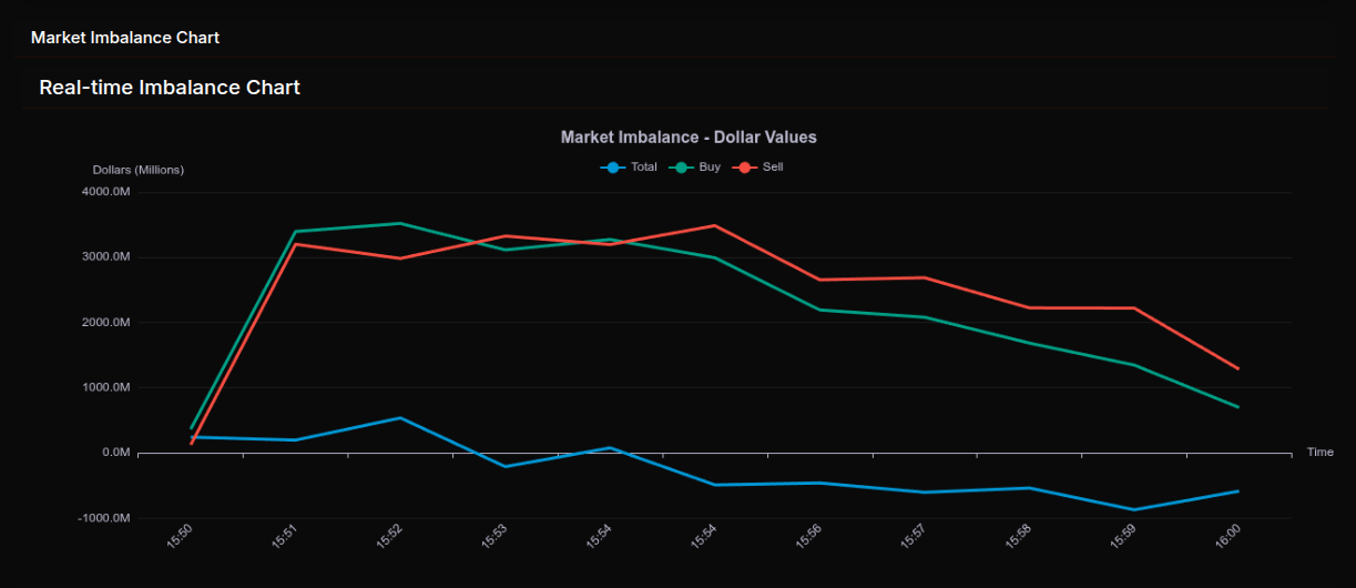 Overall, this was not a balanced rotation but a decisive late-day sell program. While some sectors and mega caps saw strong buying, the breadth and persistence of sell imbalances into the close suggest institutions were actively reducing exposure rather than simply reallocating capital.