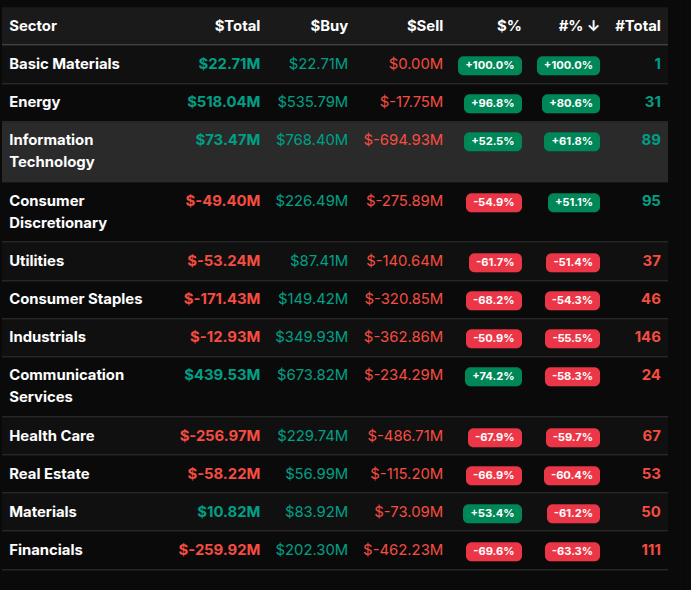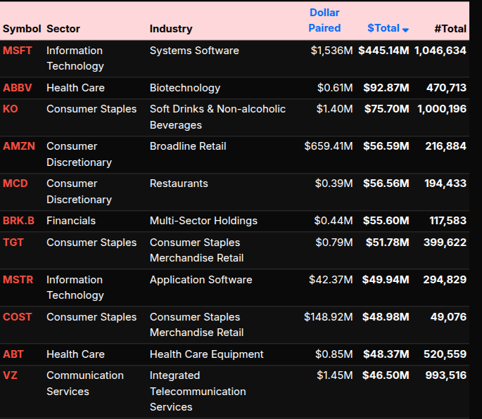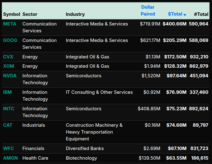 At the symbol level, the activity was concentrated in large-cap leaders. MSFT (+$445M), META (+$400M), and GOOG (+$205M) drove much of the buy-side flow, alongside energy names like CVX and XOM. NVDA and INTC also contributed to tech demand. Conversely, selling pressure was evident in names like AMZN, MCD, and BRK.B, reflecting broader consumer and financial weakness.