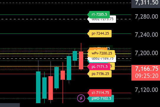 Overall, the market remains bearish below 7200.25. Any rallies into resistance are likely to be sold unless bulls can reclaim and hold above the bull/bear line. Focus on downside targets while below, and only shift bias if price regains acceptance above 7200.25.