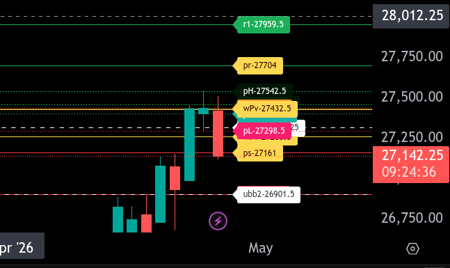 On the downside, the lower range target sits at 27161.00, which is actively being tested. A clean break and acceptance below this level opens the door for further downside continuation toward 26901.50. If selling accelerates, that level becomes a key magnet.