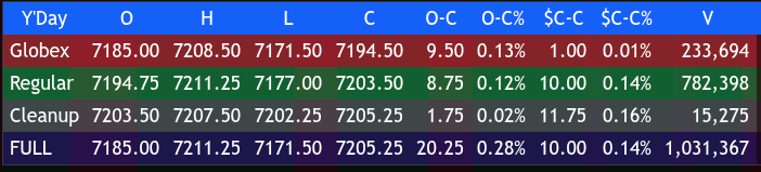 It pulled back 6.00 points down to 7201.25, traded back up to 7207.25 at 2:20, pulled back to 7205.50 at 3:10, and traded up to 7210.00 at 3:55 (reaching 7210.00 during the 3:50 cash imbalance). It traded as high as 7211.25 and eventually traded 7207.25 on the 4:00 cash close.