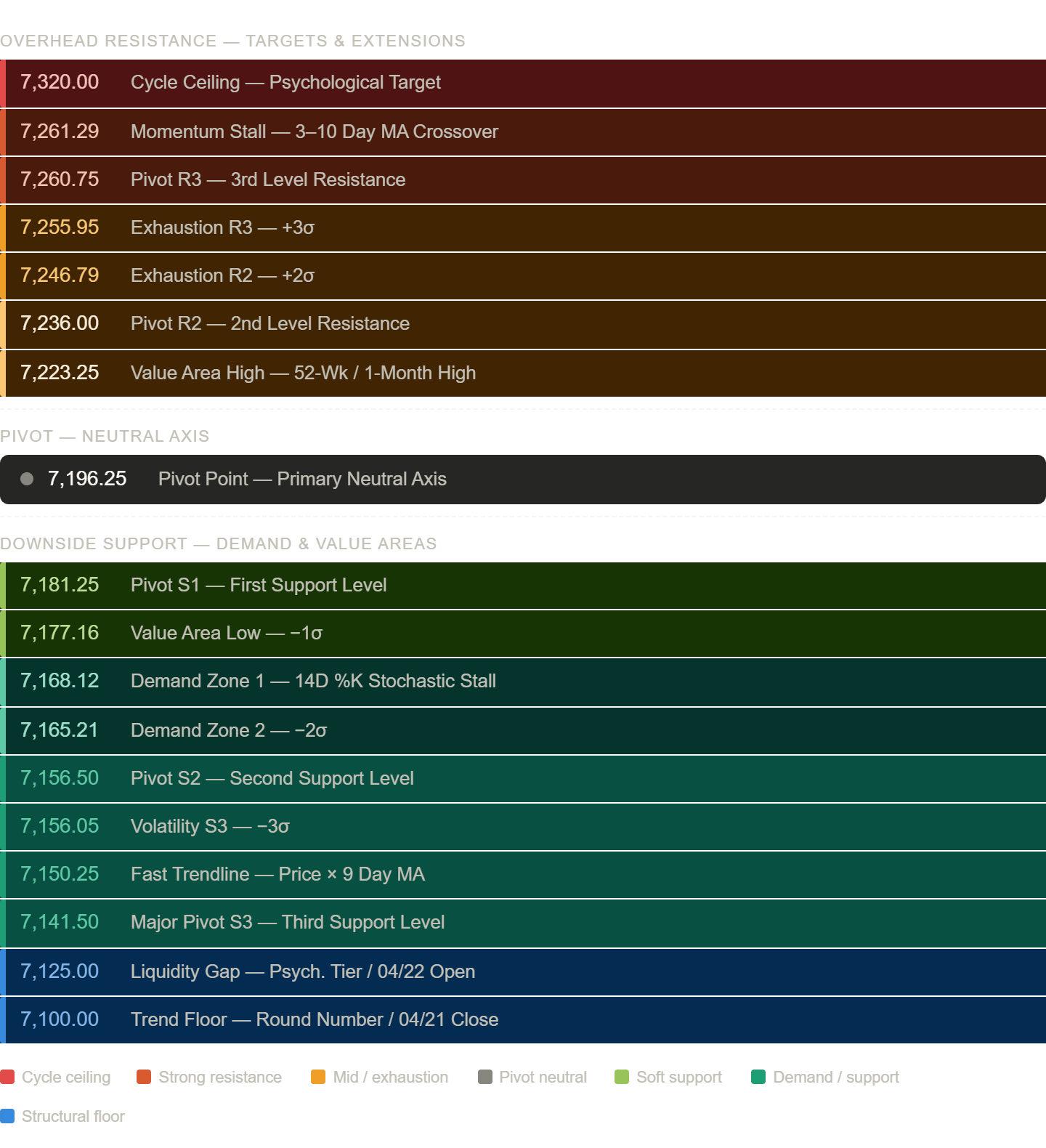 Failure to hold the pivot brings 7181.25 (Pivot S1) and the VAL at 7177.16 into immediate focus — a cluster that should attract responsive buyers on the first test. A breach of this demand zone on expanding volume is a more serious development, pointing toward the dual support shelf at 7156–7156.50, where Pivot S2 and the −3σ volatility band nearly overlap. This is the last structural defense before the tape enters the liquidity gap at 7125 — the April 22nd open — and ultimately the Trend Floor at 7100, the round number coinciding with the April 21st close.