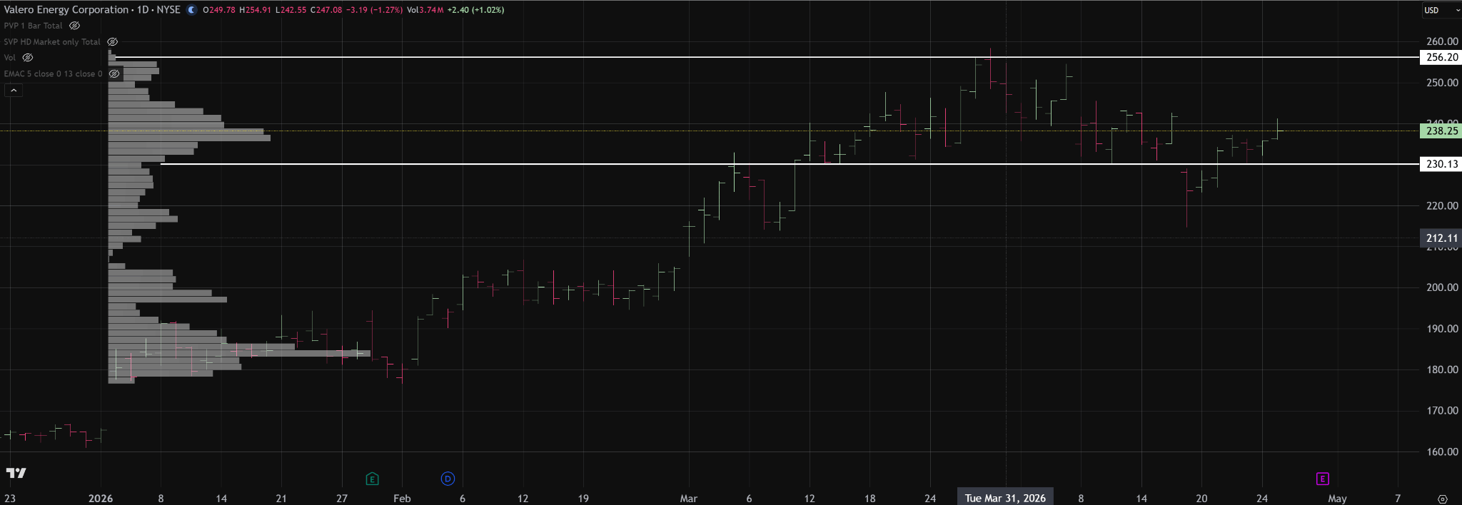 Valero Energy (VLO) is in a clearly defined distribution that the market is acknowledging between roughly 230 and 256. Price briefly closed below the 230 level, but that breakdown was quickly rejected. Over the last five trading days, price has re-established acceptance back inside the balance area.