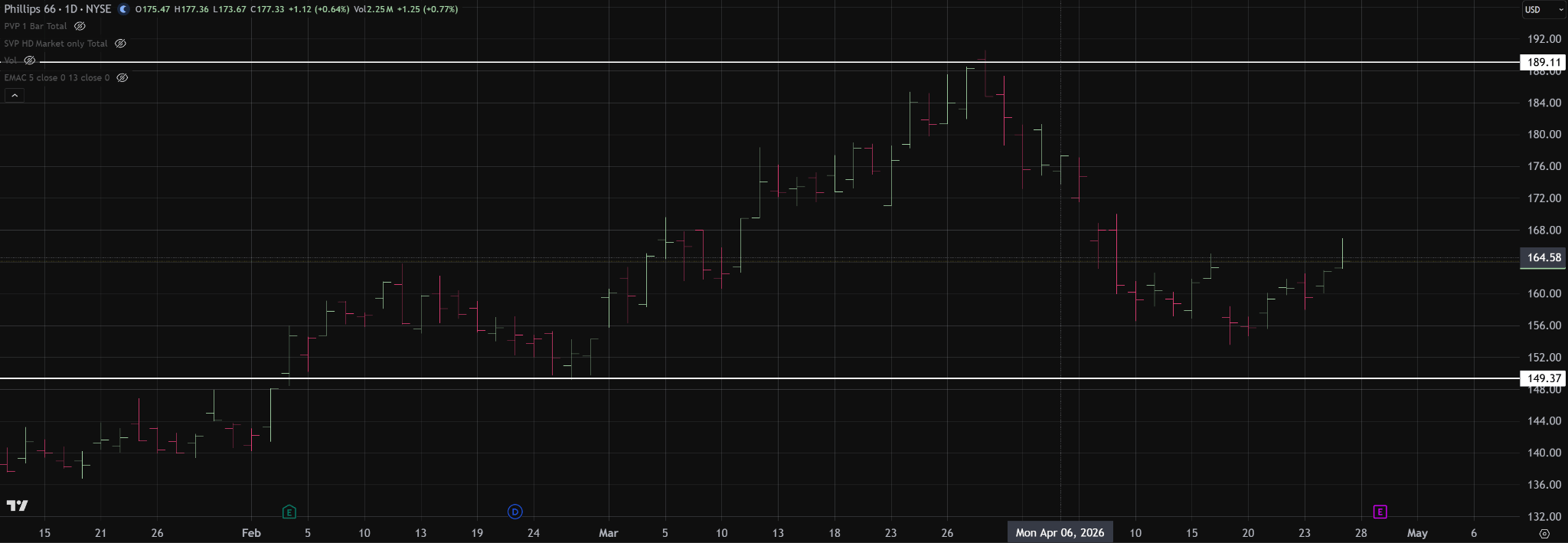 Since February, Phillips 66 (PSX) has been trading within a clearly defined distribution between roughly 149 and 189. After reaching the upper end of that range in March, price rotated lower, but the recent action suggests that downside pressure has begun to stabilize.