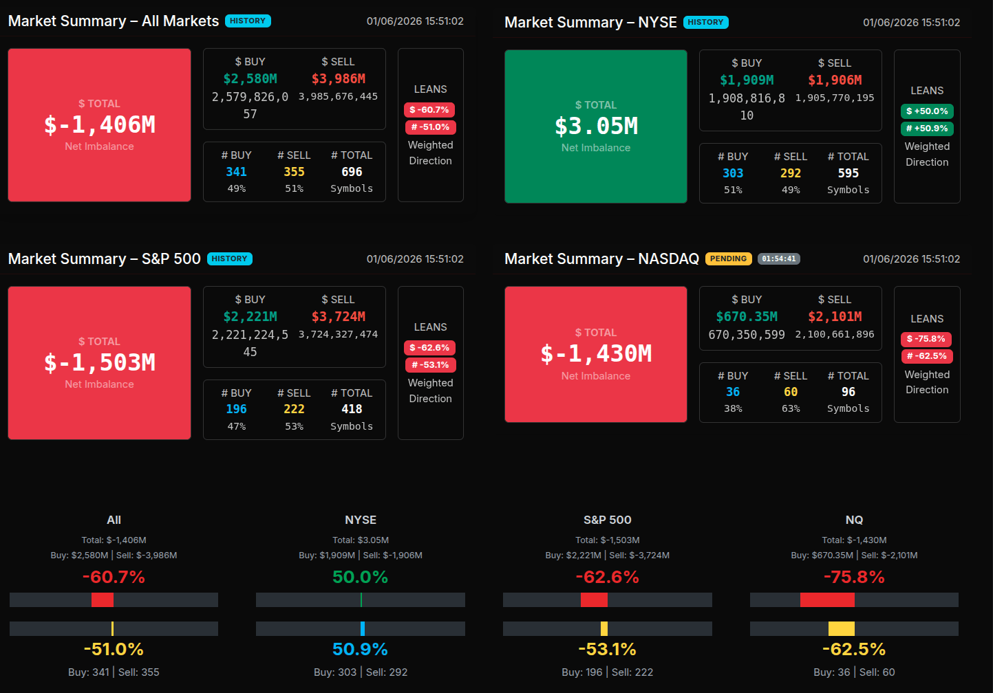Index summaries capture the split tape. NYSE closed with a small positive net and a +50% lean, while the S&P 500 (-62.6%) and Nasdaq (-75.8%) finished with pronounced sell-side pressure. Overall, the session evolved from a broad sell imbalance into a late buy program, but the dominance of negative sector leans suggests the close was more about offsetting exposure than a clean risk-on rotation.