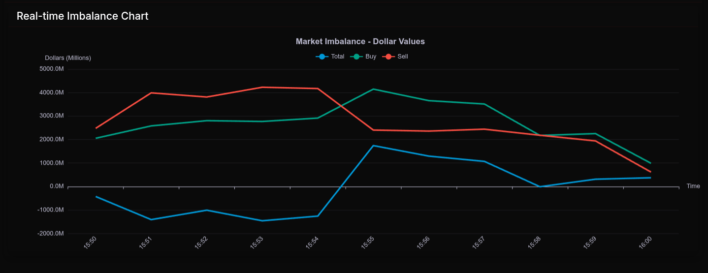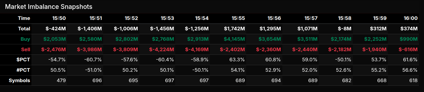 That tone shifted decisively at 3:55. Buy imbalances surged above $4.1B while sell pressure collapsed toward -$2.4B, flipping the net to +$1.74B and pushing percentage leans above +63%. This late reversal carried through 3:56 and 3:57, though the magnitude steadily faded into the close, finishing with a modest +$374M net imbalance at 4:00.