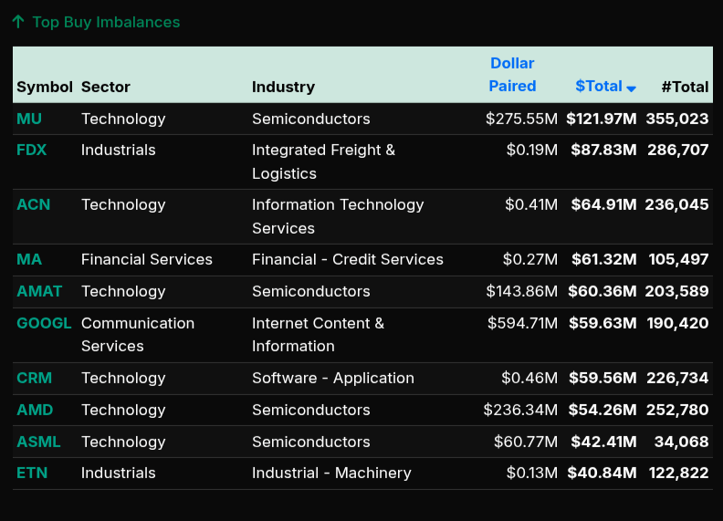 On the single-name level, activity was concentrated in megacap leadership. TSLA, MSFT, NVDA, AAPL, and AMZN dominated dollar flow, underscoring that large-cap liquidity was the primary driver of the auction. Despite the heavy sector-level selling, top buy imbalances clustered in Technology and Industrials late, with MU, AMAT, AMD, and ASML highlighting targeted dip-buying in semiconductors rather than a full-sector reversal.