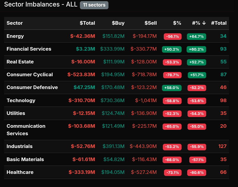 Sector data reinforces the early liquidation narrative. Consumer Cyclical (-78.7%), Healthcare (-73.1%), Basic Materials (-68.0%), Communication Services (-65.0%), and Technology (-58.8%) all registered strong sell leans. These readings, many well beyond the -66% threshold, point to wholesale selling rather than internal sector reshuffling. Industrials and Real Estate also leaned decisively lower, keeping pressure broad. Financial Services stood out as one of the few areas with a positive tilt, finishing +50.2%, while Consumer Defensive posted a +58.0% lean, reflecting late defensive demand.
