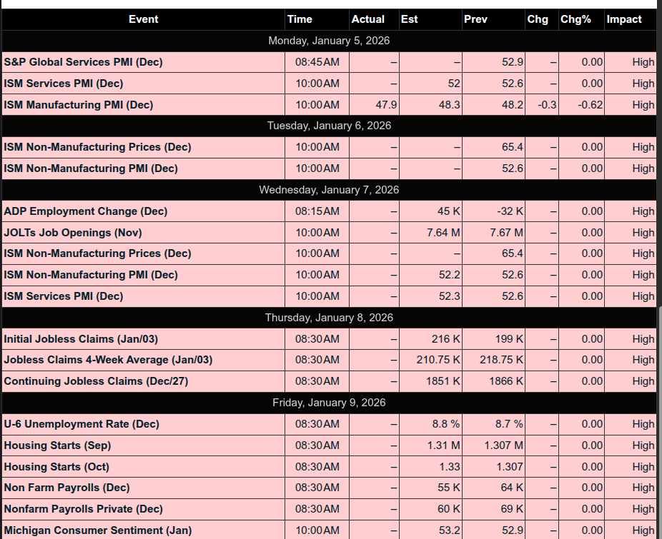 • Overnight futures are steady ahead of ADP Employment, ISM Services PMI, and JOLTS Job Openings, all seen as precursors to Friday’s December jobs report and potential signs of labor market cooling that could influence future Fed rate cuts.