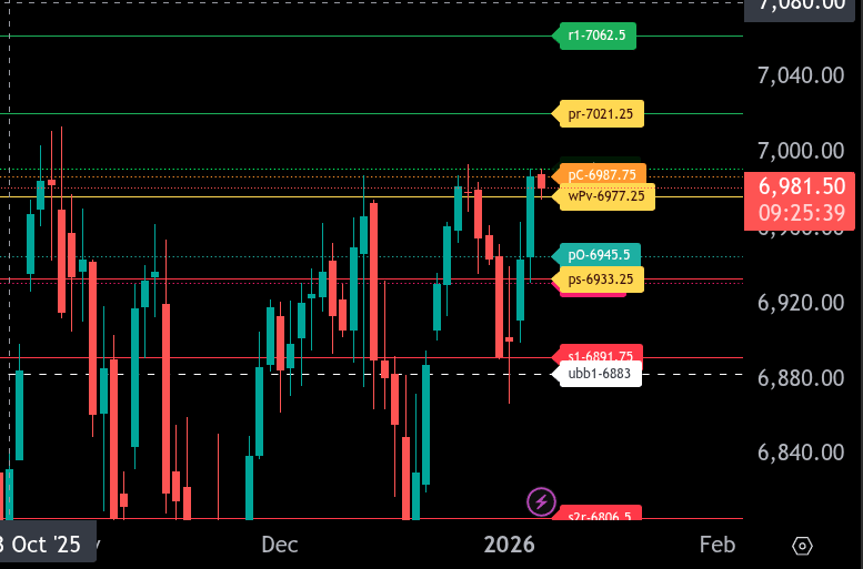 On the downside, a failure to hold 6977.25 puts 6945.50 in play as first support, followed by 6933.25, the lower range target. A break and hold below 6933.25 increases the odds of a deeper flush toward 6891.75.