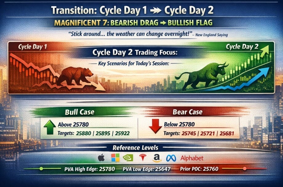 The bull/bear line for the NQ is at 25,766.25. This remains the key pivot for today. Holding below this level keeps the near-term tone cautious, while acceptance back above would shift bias back to the upside.