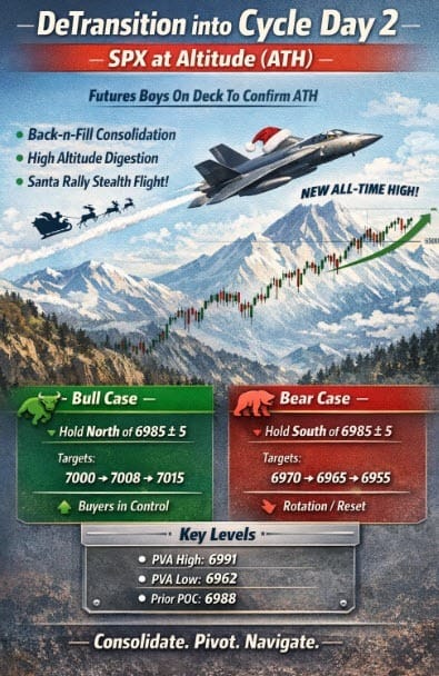 The bull/bear line for the ES is at 6977.25. This remains the key pivot for today. Holding above this level keeps the near-term bias neutral-to-bullish, while acceptance below it would tilt the tape back to the downside.