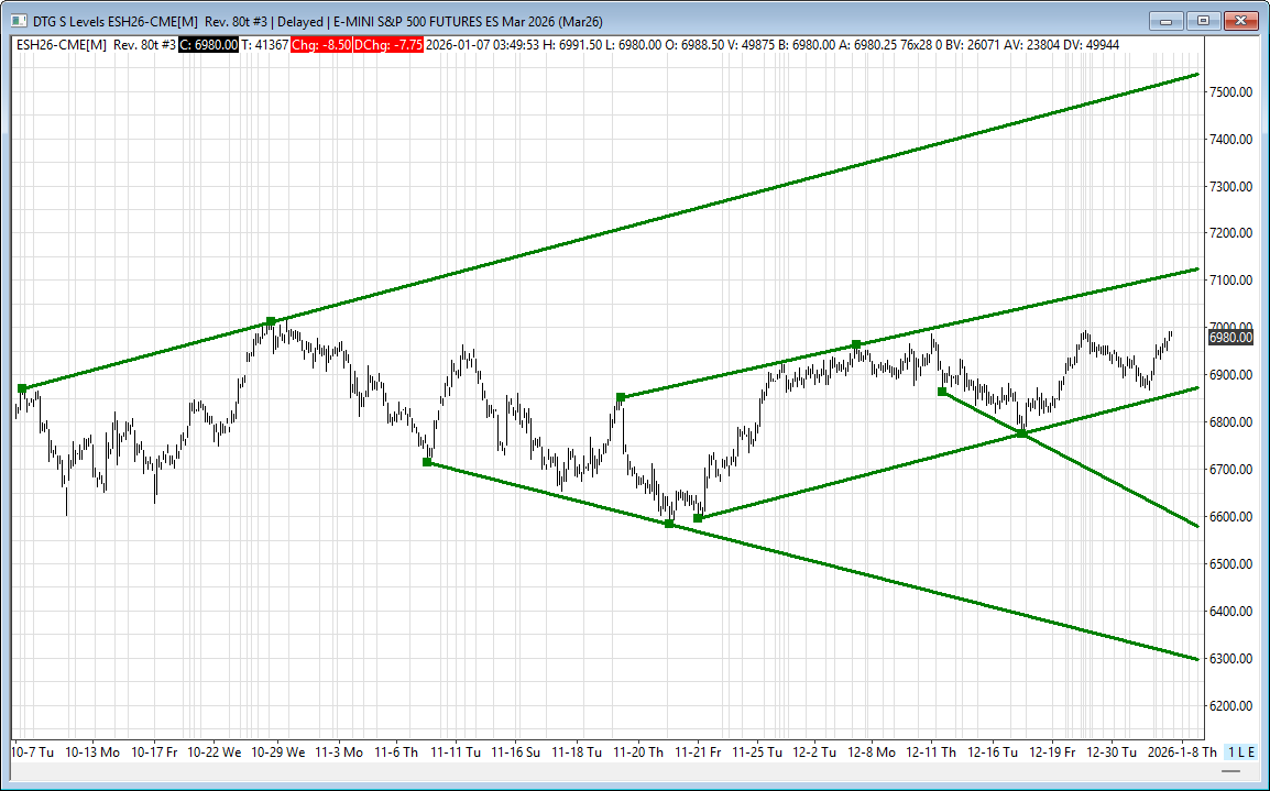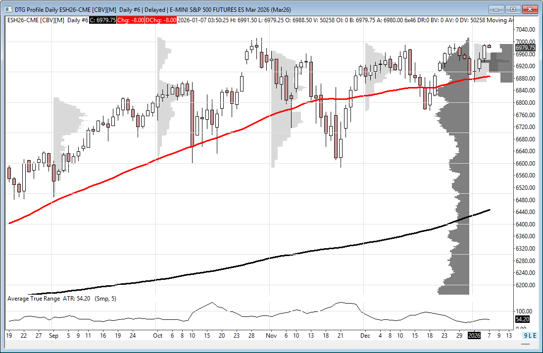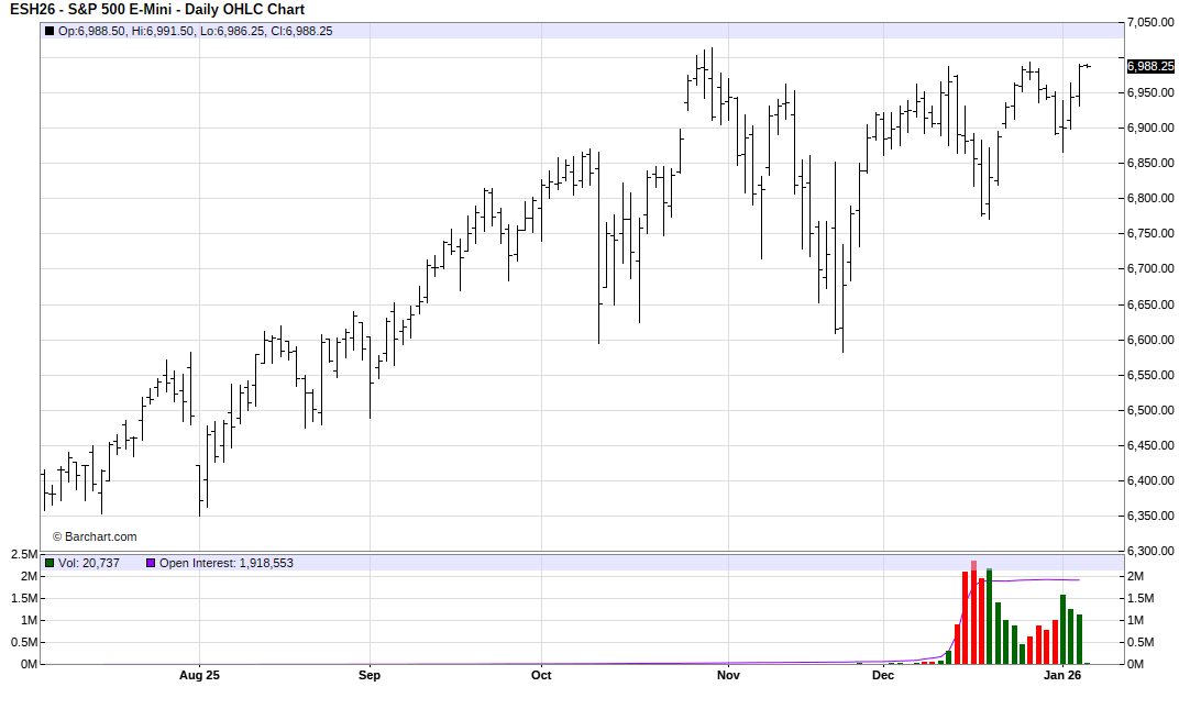 The current front-month ESH25 contract high is 7014. I still think the ES is going to new highs, but like I’ve said many times, 2026 is going to be the year of increased volatility — and clearly, the news so far in 2026 points to just that. Use stops.