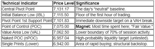 • Expansion Play: With the Latest Price (7,158.50) holding above the VAH (7,150.00), the market is currently in an “out-of-value” state. If the price remains above the IB high, bulls are looking for a test of the 7,185.75 historical highs.