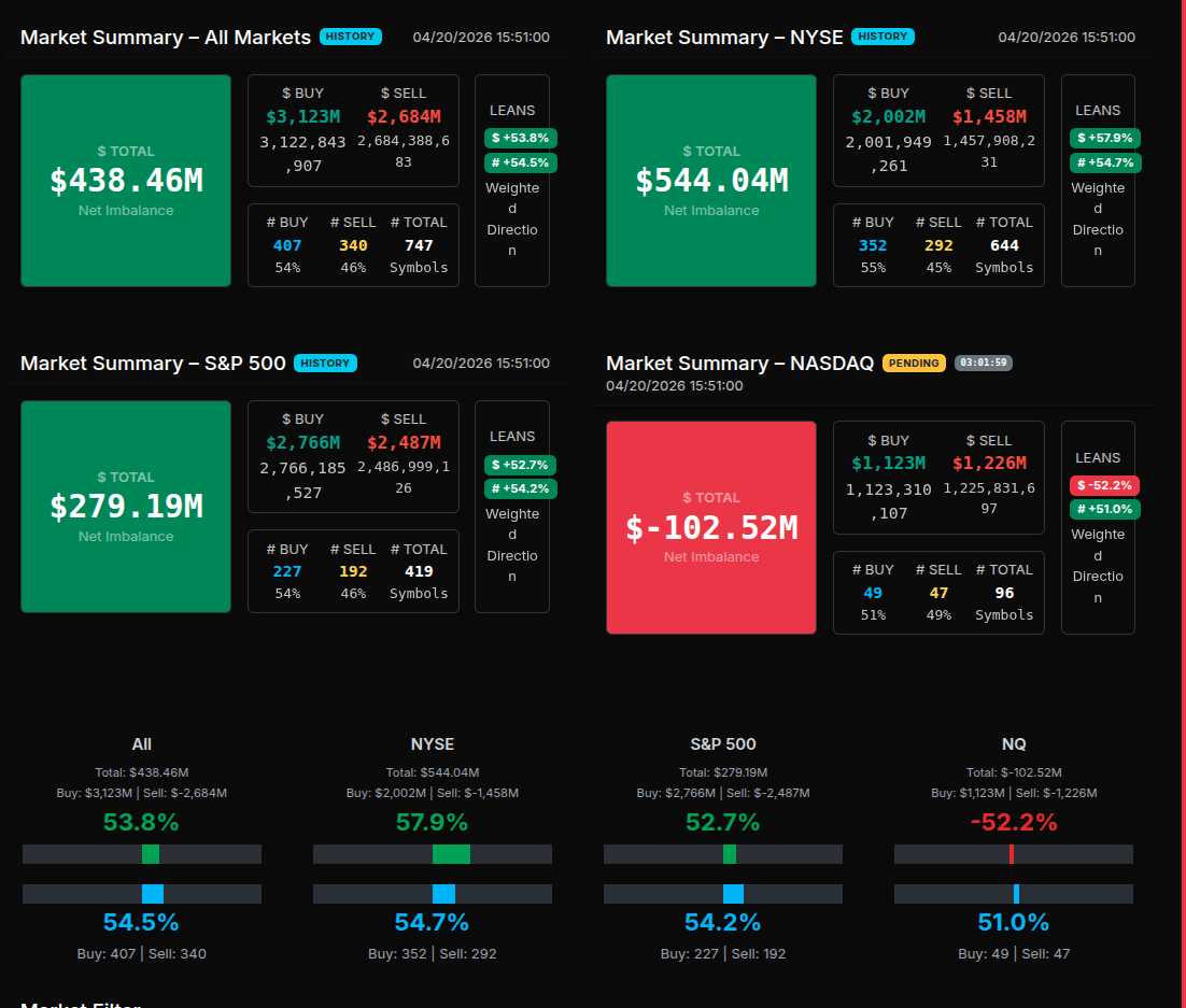 The MOC session opened with a clear buy-side imbalance, but importantly, not at an extreme level. Early snapshots at 15:50 showed +70.6%, and while that indicates directional demand, it sits closer to rotational than wholesale. This was confirmed by the broader market summary showing +53.8% overall and +57.9% on NYSE—firmly positive but not stretched. The S&P 500 echoed this with a +52.7% lean, while Nasdaq diverged slightly at -52.2%, signaling early two-way trade rather than synchronized institutional buying.