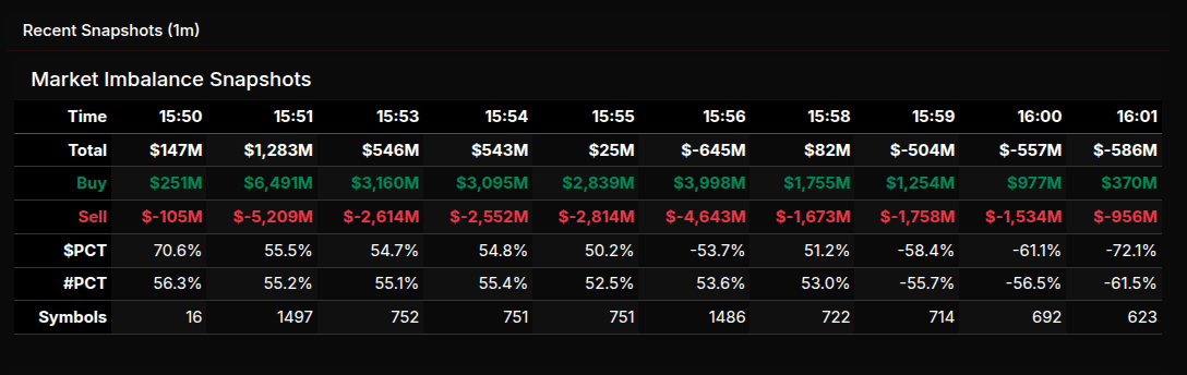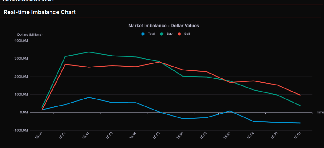 The transition phase began around 15:56, where the imbalance sharply flipped to -53.7% and continued to deteriorate into the close, reaching -72.1% by 16:01. This is a key signal—crossing the -66% threshold indicates a wholesale shift to sell-side dominance. The late ramp in sell programs, particularly with totals moving to -$500M to -$586M, confirms institutions leaning into supply into the bell rather than absorbing it.