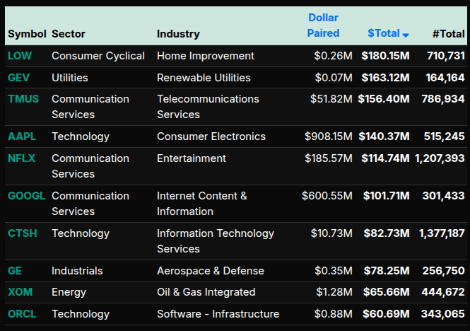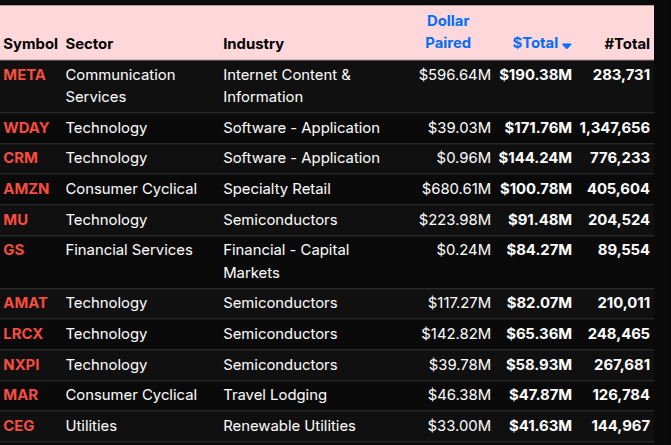 At the symbol level, there was clear dispersion. META (+$190M), AMZN (+$100M), and MU (+$91M) led the buy side, while flows into LOW (+$180M), AAPL (+$140M), and TMUS (+$156M) reinforced participation across sectors. On the sell side, heavy supply concentrated in software and semis, including WDAY, CRM, and AMAT, highlighting rotation out of growth into more defensive or yield-sensitive areas.