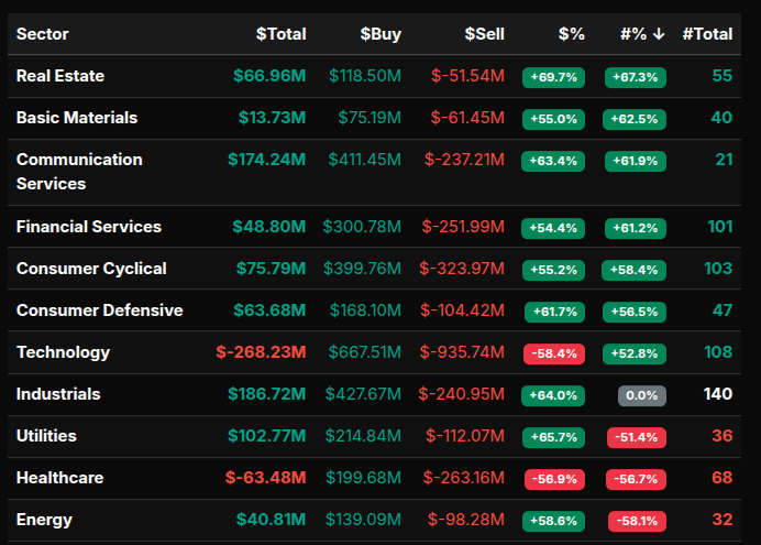 Sector flows were mixed but leaned constructive overall. Industrials (+64%), Utilities (+65.7%), Real Estate (+69.7%), and Communication Services (+63.4%) showed strong buy-side control, though mostly below the extreme threshold. Technology (-58.4%) and Healthcare (-56.9%) stood out as relative laggards, both showing persistent sell pressure, though not quite at capitulation levels.