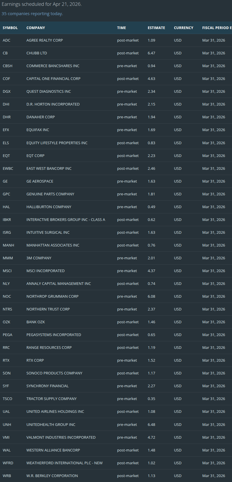 • After close: COF, IBKR, ISRG, UAL, AMX