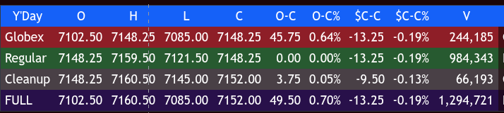 At 9:29 AM, the ES was at its high of 7148.25 and opened Monday’s regular session at 7148.25, down 13.25 points or -0.19%, with 255k contracts traded.