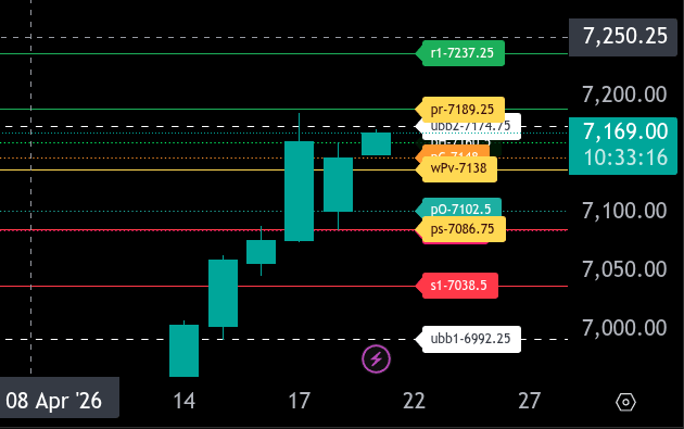 • Value Area High (VAH): 7,150.00 — Current support; breakout above confirms strength.