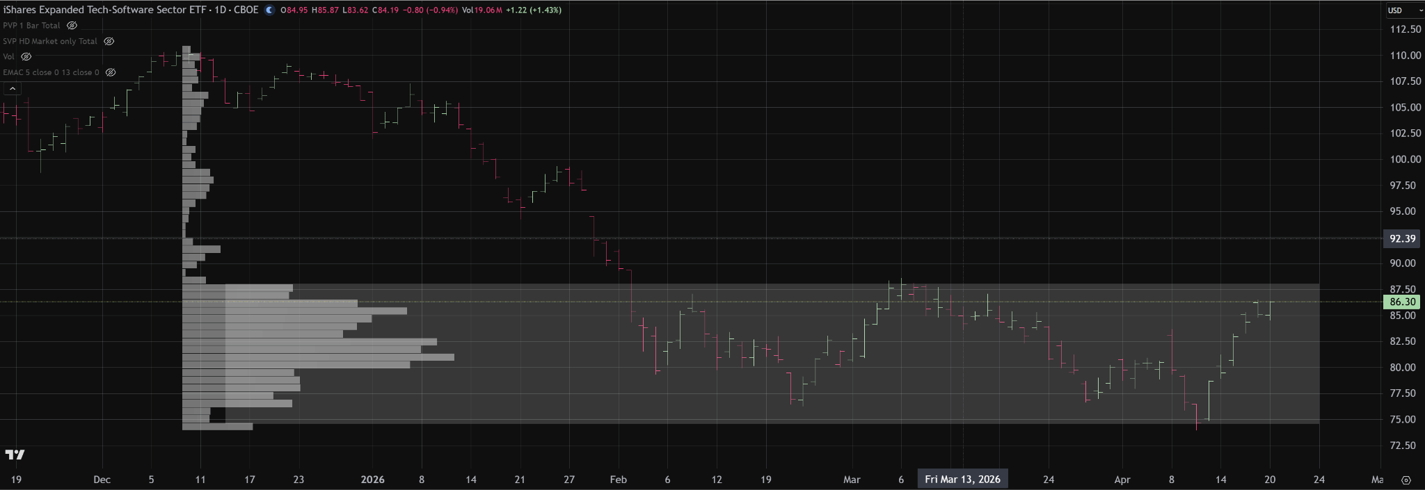 IGV is testing the upper edge of a well-established value area between 75 and 88. Unless price can hold above 88 and build acceptance, this move should still be viewed as a rotation within balance, with risk of returning back through value and potentially toward the lower end of the range near 75.