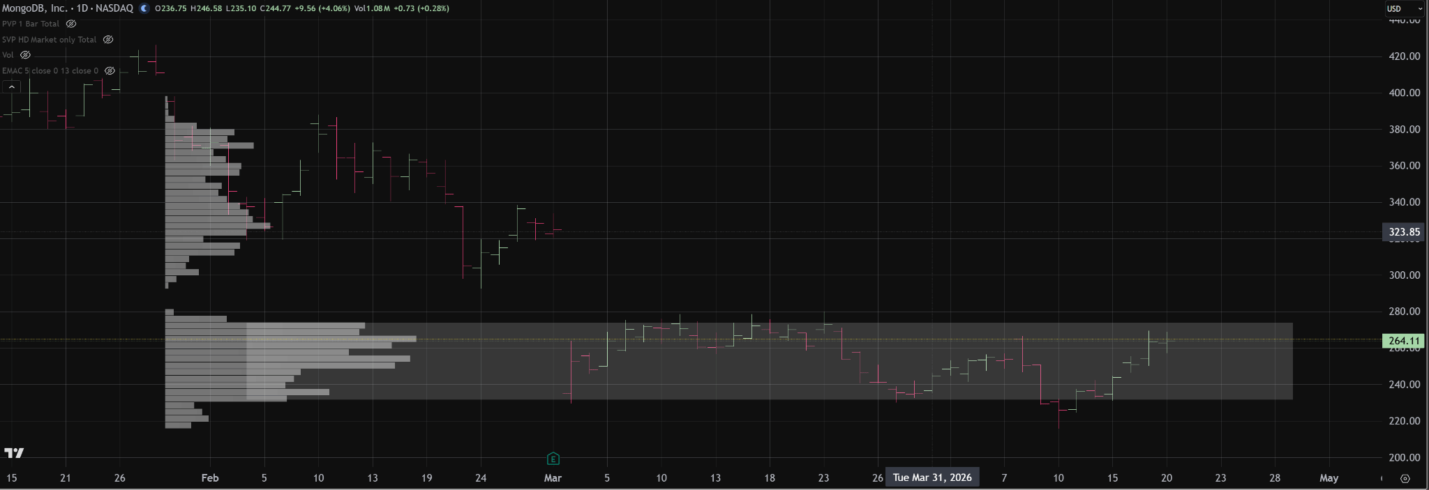 MDB is trading within a well-established area of acceptance between roughly 235 and 275. Price has now rotated back toward the upper half of that balance, putting the market in a decision area. Unless buyers can push above 275 and establish acceptance, this move should still be viewed as a rotation within balance, with risk of returning back through value and potentially toward the lower end of the range near 235.