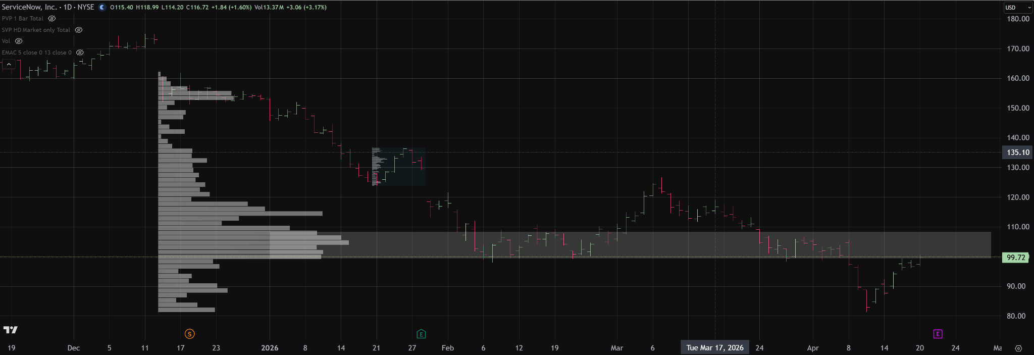 NOW is trading below a major high-volume area roughly between 95 and 108. From an auction perspective, that prior area of heavy acceptance should now be viewed as potential overhead resistance. The key issue is whether buyers can re-enter that area and establish acceptance, or whether the market is rejected from it and remains below value. If price cannot gain acceptance back into that high-volume zone, the rally is likely just a counter-trend move within a weaker auction. Acceptance back into and through that area would be the first sign that the market is repairing the damage and attempting to rebuild value higher.