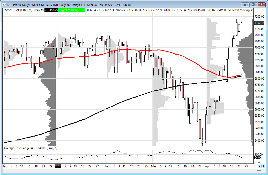After 4:00, the ES traded 7149.50, traded 7145.00, and then traded up to 7160.50 after a headline hit that Iran reopened the Strait of Hormuz. But Trump came out saying the blockade on Iranian ships and ports will stay in effect, and the ES sold off down to 7151.50 and settled at 7152.00, down 9.50 points or -0.13%.