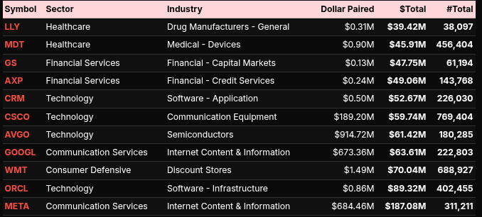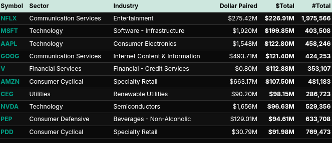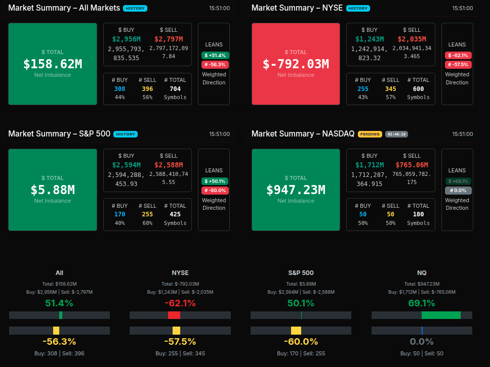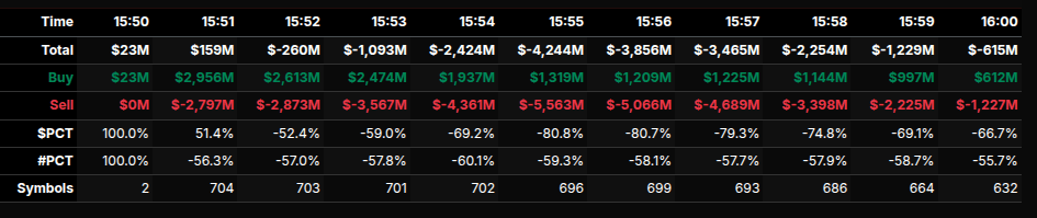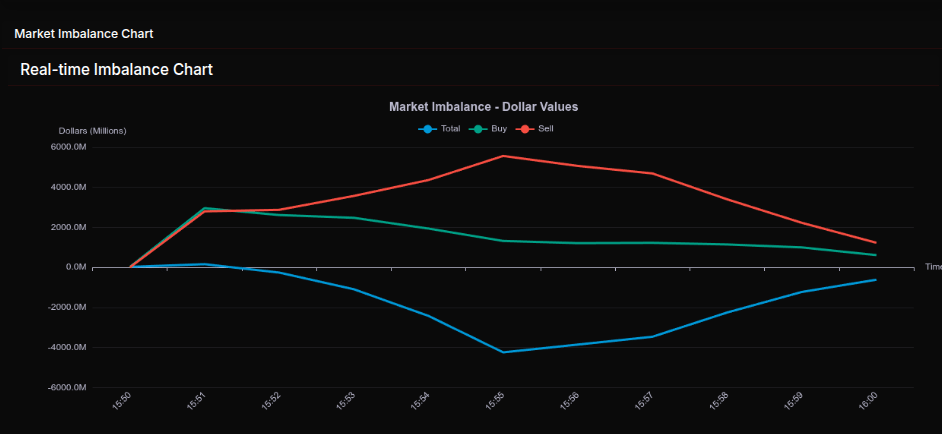 The MOC opened with a small positive imbalance but immediately flipped into a heavy sell program as NYSE flows dominated the tape. At 15:50 the market showed a modest +$23M buy imbalance, but by 15:51 the number declined to +$159M — the last positive imbalance on the MiM for the rest of the close. By 15:52 the auction reversed sharply to –$260M, and over the next three minutes the sell side accelerated to a session low of –$4.24B at 15:54. From there, the imbalance recovered but remained negative, settling near –$615M into the bell.